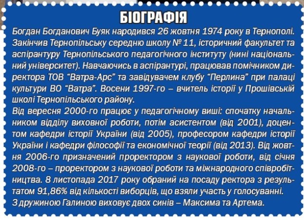 Нещодавно колектив Тернопільського національного педагогічного університету ім. В. Гнатюка практично одностайно проголосував за нового ректора. Ним став Богдан Богданович Буяк. «Номер один» знайомить своїх читачів з цією неординарною людиною, котра пройшла нелегкий шлях від студента до ректора одного з провідних вузів нашої країни.