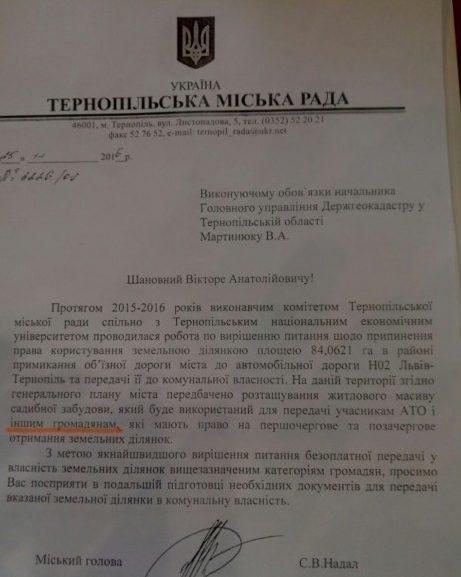 Влада Тернополя постійно апелювала, що 84 га «університетської» землі роздасть бійцям АТО. Однак редакція «Номер один» має у своєму розпорядженні листа, в якому чорним по білому зазначається, що, окрім учасників бойових дій, землі на даному масиві планується передати й «іншим громадянам, які мають право на першочергове та позачергове отримання земельних ділянок».