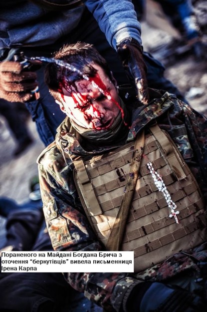 – Так, бій із «тітушками» та «Беркутом» в Маріїнському і поранення на Інститутській… Перші трупи в будинку офіцерів… Пам’ятаю, писав СМС-ку одному з наших нардепів, що нас оточили, є перші жертви. Правда, тоді він нічого не відповів. Вийшов на зв’язок пізніше, але…Тоді, як на мене, вони самі не знали, чим все це закінчиться. У будинок офіцерів приїхав до нас нардеп Олесь Доній та письменниця Ірена Карпа. З ними було ще кілька депутатів. От вони нас почали вивозити з дому офіцерів, бо «Беркут» його оточив. Карпа, власне, мене з пораненням і вивела. Завезла у такий підпільний шпиталь. Там мені вперше зробили перев’язку і сказали, що треба оперувати, видаляти з голови частинки від каски. Згодом вона ж мене і доправила до кума на квартиру. Там я трохи відлежався і наступного дня знову пішов на барикади. Як сьогодні пам’ятаю 20 лютого, коли полягло найбільше людей… На моїх очах возили трупи в Михайлівський… Дуже важко. Хоча й потім була перемога.