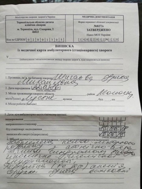 – Прізвища жінка не називає, бо не пам’ятає його. Розповідає, що в них немає коштів, щоби лежати 21 день у лікарні, та й не може вона покинути чоловіка і всіх діток на такий великий проміжок часу. Як тільки я дізналася про цей випадок, одразу написала пост у мережі «Фейсбук», вважала, що цій родині конче потрібно допомогти. Під моїм постом було дуже багато коментарів, хочу подякувати всім людям, які підтримали нас, працювали разом з нами і допомогли цій родині. Я намагалася залучити Монастириську районну раду і голову села, який не навідувався до багатодітної родини, хоча це входить у його обов’язки і соціальної служби, котрі повинні були тримати на контролі факт хвороби дитини та спостерігати за тим, чи є належні умови для проживання, чи є у дитини все необхідне тощо.
