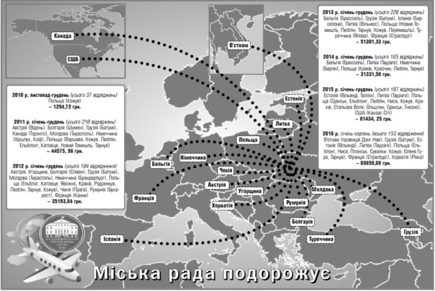 Від В’єтнаму до Франції, від США до Молдови. Де тільки не були чиновники мерії та деякі депутати під приводом офіційних відряджень!Звичайно, що їм далеко, приміром, до народних депутатів України, які, за даними нардепа Тетяни Чорновол, «виїздили» у 2015 році 7,4 млн. бюджетних гривень. У нас мова йде лише про кілька десятків тисяч на рік (див. інфографіку №1). Однак маршрут не менш обширний, та, вочевидь, лише для обраних.