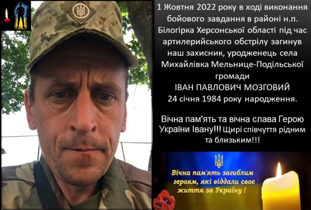 На жаль, наш Борщівський край втратив ще одного патріота і свого захисника, жителя села Михайлівка Мельнице-Подільської громади. З далекої Херсонщини надійшла сумна звістка про загибель солдата Івана Павловича Мозгового (24.01.1984 року народження). Наш захисник потрапив під артилерійський вогонь та отримав поранення несумісні з життям.
