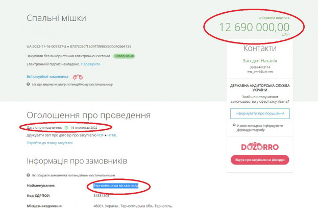 16 листопада Тернопільська міська рада провела закупівлю без тендера очікуваною вартістю у 12 690 000 гривень. На таку суму до Тернополя, начебто, має поїхати 4500 спальних мішків https://prozorro.gov.ua/tender/UA-2022-11-16-009137-a. Термін поставки – до 20 грудня.