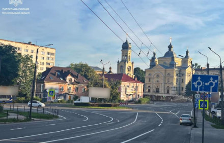 На транспортній розвʼязці вулиць Микулинецької— Торговиці— Князя Василя Костянтина Острозького — Гайової — Замонастирської організовано рух по колу, про що й інформує дорожній знак...