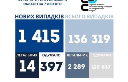 1 415 нових випадків коронавірусної хвороби COVID-19 зафіксовано в Тернопільській області за 07 лютого 2022 року. Про це повідомляє Державна установа «Тернопільський ОЦКПХ МОЗ...
