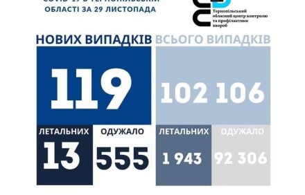 119 нових випадків коронавірусної хвороби COVID-19 зафіксовано в Тернопільській області за 29 листопада. Про це повідомляє Державна установа «Тернопільський ОЦКПХ МОЗ України» Також за...