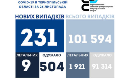 231 новий випадок коронавірусної хвороби COVID-19 зафіксовано в Тернопільській області за 26 листопада. Про це повідомляє Державна установа «Тернопільський ОЦКПХ МОЗ України» Також за...