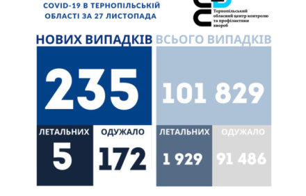 235 нових випадків коронавірусної хвороби COVID-19 зафіксовано в Тернопільській області за 27 листопада. Про це повідомляє Державна установа «Тернопільський ОЦКПХ МОЗ України» Також за...