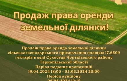 Копичинецька міська рада оголошує аукціон, щодо продажу права оренди земельної ділянки сільськогосподарського призначення, площею 17,6309 гектарів, в селі Сухостав, Чортківського району, Тернопільської області.Період подання...