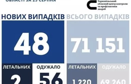 48 нових випадків коронавірусної хвороби COVID-19 зафіксовано в Тернопільській області за 25 серпня 2021 року. За останню добу найбільша кількість підтверджених випадків зареєстрована у...