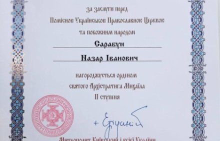 Військовий з Тернопільщини отримав орден від митрополита Епіфанія. Нaгороду отримав Нaзaр Сaрaбун, керівник «Прaвого сектору» Тернопільської облaсті, який сьогодні воює нa передовій.