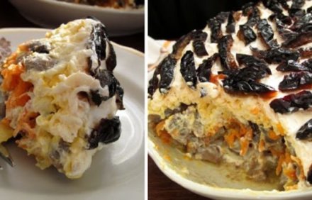 400 г курячої печінки, 400 г печериць, 2 середні цибулини, 2 моркви, 4-5 яєць, 2 плавлених сирки, 7-8 шт. чорносливу, масло для смаження, сіль...