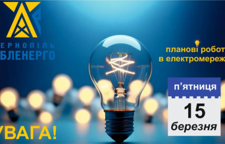 ВАТ «Тернопільобленерго» повідомляє, що сьогодні, 14 березня, у зв’язку із виконанням ремонтних робіт на лініях електропередач та трансформаторних підстанціях відбудуться тимчасові перерви в електропостачанні...