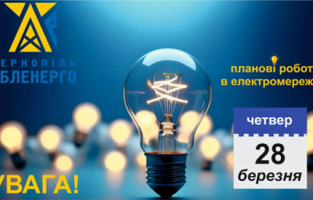 ВАТ «Тернопільобленерго» повідомляє, що сьогодні, 28 березня, у зв’язку із виконанням ремонтних робіт на лініях електропередач та трансформаторних підстанціях відбудуться тимчасові перерви в електропостачанні...