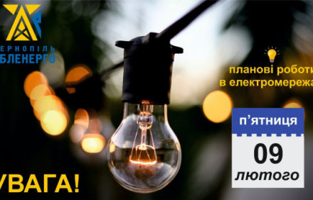 ВАТ «Тернопільобленерго» повідомляє, що сьогодні, 19 лютого, у зв’язку із виконанням ремонтних робіт на лініях електропередач та трансформаторних підстанціях відбудуться тимчасові перерви в електропостачанні...