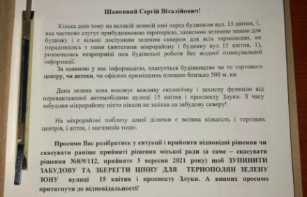 25 листопада ініціативна група подала до Тернопільської міської ради колективне звернення щодо збереження зеленої зони на перехресті вулиці 15 квітня та проспекту Злуки. –...