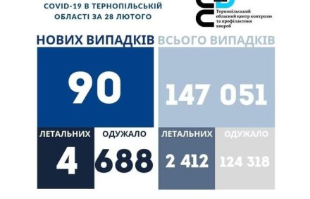90 нових випадки коронавірусної хвороби COVID-19 зафіксовано в Тернопільській області за 28 лютого 2022 року. Про це повідомляє Державна установа «Тернопільський ОЦКПХ МОЗ України»....