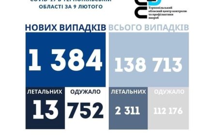 1 384 нових випадків коронавірусної хвороби COVID-19 зафіксовано в Тернопільській області за 09 лютого 2022 року. Про це повідомляє Державна установа «Тернопільський ОЦКПХ МОЗ...