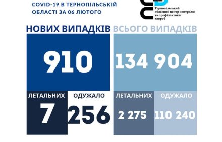 910 нових випадки коронавірусної хвороби COVID-19 зафіксовано в Тернопільській області за 06 лютого 2022 року. Про це повідомляє Державна установа «Тернопільський ОЦКПХ МОЗ України»....