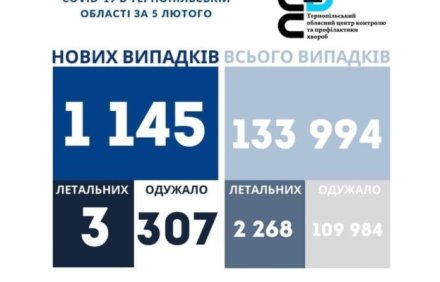 1 145 нових випадків коронавірусної хвороби COVID-19 зафіксовано в Тернопільській області за 5 лютого 2022 року. Про це повідомляє Державна установа «Тернопільський ОЦКПХ МОЗ...