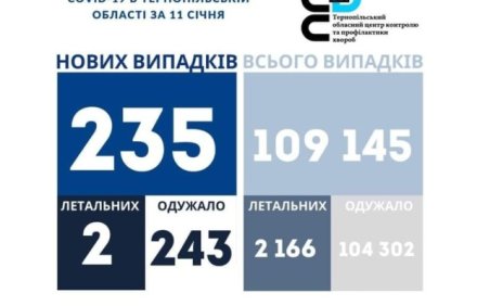 235 нових випадків коронавірусної хвороби COVID-19 зафіксовано в Тернопільській області за 11 січня 2022 року. Про це повідомляє Державна установа «Тернопільський ОЦКПХ МОЗ України». Також...