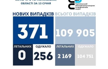 371 новий випадок коронавірусної хвороби COVID-19 зафіксовано в Тернопільській області за 13 січня 2022 року. Про це повідомляє Державна установа «Тернопільський ОЦКПХ МОЗ України»....