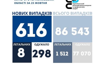 616 нових випадів коронавірусної хвороби COVID-19 зафіксовано в Тернопільській області за 23 жовтня. Про це повідомляє Державна установа «Тернопільський ОЦКПХ МОЗ України» Також...
