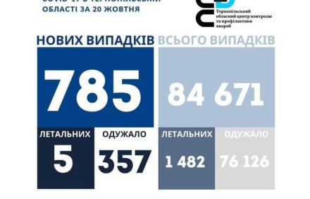 785 нових випадів коронавірусної хвороби COVID-19 зафіксовано в Тернопільській області за 20 жовтня 2021 року. Про це повідомляє Державна установа «Тернопільський ОЦКПХ МОЗ...