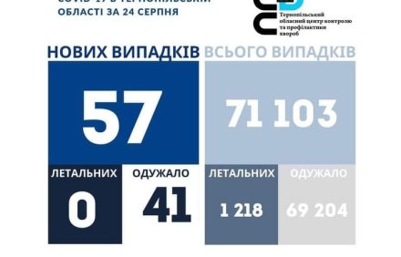 57 нових випадків коронавірусної хвороби COVID-19 зафіксовано в Тернопільській області за 24 серпня. Про це повідомляє Державна установа «Тернопільський ОЦКПХ МОЗ України». Також за...