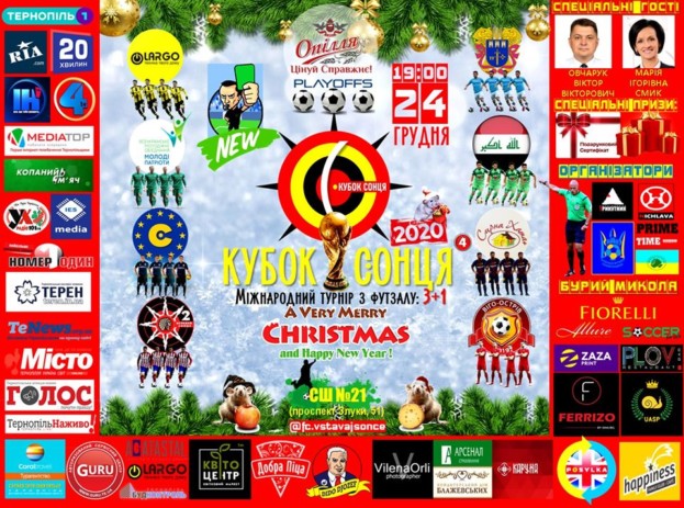 24.12.2019р. в спортзалі Тернопільського ліцею №21(Злуки-51) спеціалізованої мистецької школи імені Ігоря Ґерети, о 19:00 відбудеться 4-й міжнародний різдвяно-новорічний турнір з футзалу: КУБОК СОНЦЯ