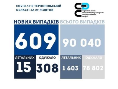 609 нових випадів коронавірусної хвороби COVID-19 зафіксовано в Тернопільській області за 29 жовтня. Про це повідомляє Державна установа «Тернопільський ОЦКПХ МОЗ України»
