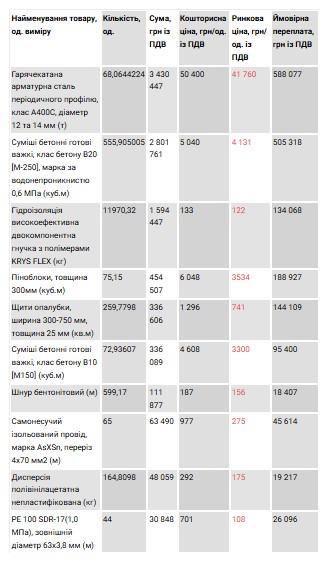 Натомість будівельні матеріали у кошторисі мають вищу ціну порівняно з ринковими. Арматурну гарячекатану сталь періодичного профілю, класу А400С, діаметром 12 і 14 мм, заклали по 50 400 грн/т. У Тернополі «Метінвест СМЦ» пропонує таку по 33 700 грн/т, «Стальміра» – по 32 552 грн/т, «Vikant» у Тенополі – 41 760 грн/т, що на 15-35% дешевше.