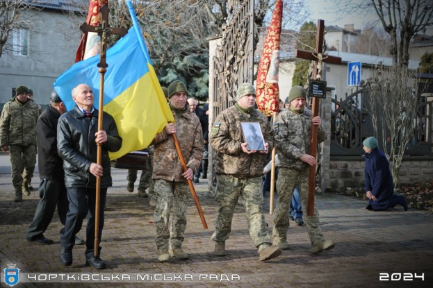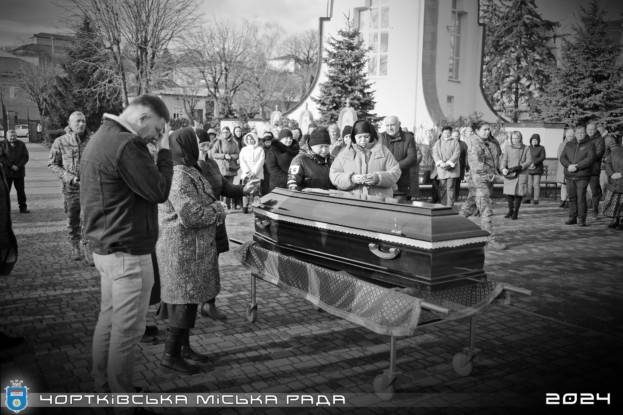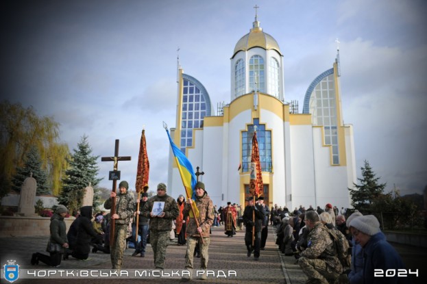 Сьогодні, 21 листопада, жителі Чортківської громади на колінах зустріли тіло померлого воїна Савки Павла (25.12.1970 – 19.11.2024) на подвір’ї Собору верховних Апостолів Петра і Павла.