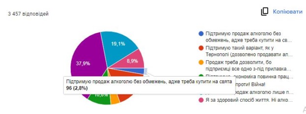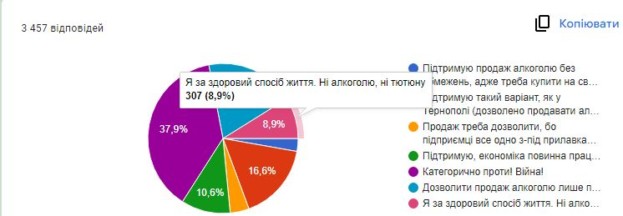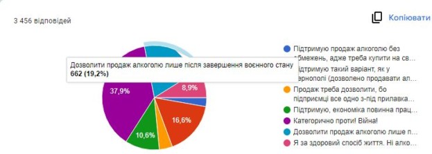 19,1% – 662 голоси – дозволити продаж алкоголю лише після завершення воєнного стану