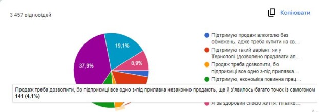 4,1% – 141 голос – продаж треба дозволити, бо підприємці все одно з-під прилавка незаконно продають, ще й з’явилось багато точок із самогоном