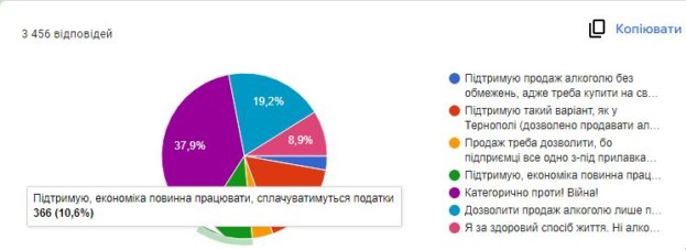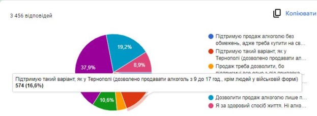 16,6% – 574 голоси – підтримую такий варіант, як у Тернополі (дозволено продавати алкоголь з 9 до 17 год, крім людей у військовій формі)