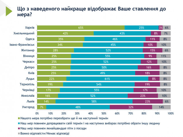 За даними дослідження, 19% опитаних вважають, що мер повинен якнайшвидше покинути свою посаду, щоб не шкодити місту. Водночас 19% вважають, що мера потрібно переобрати на наступний термін.