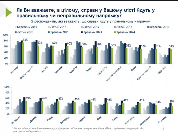Істотно зменшилась кількість жителів міста, які вважають, що справи у місті йдуть у правильному напрямку. Якщо у травні 2021 року так вважали 70% опитаних, то тепер лише 53%.