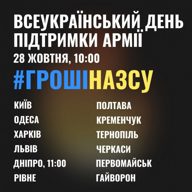 28 жовтня о 10:00-11:00 у 12-ти містах відбудеться перший ВСЕУКРАЇНСЬКИЙ ДЕНЬ ПІДТРИМКИ АРМІЇ. Київ, Одеса, Львів, Дніпро, Харків, Черкаси, Тернопіль, Кременчук, Рівне, Полтава, Гайворон та Первомайськ об’єдналися заради спільної мети – нагадати місцевій та центральній владі, що в Україні йде кровопролитна війна і першим пріоритетом бюджетів всіх рівнів має бути ЗСУ.