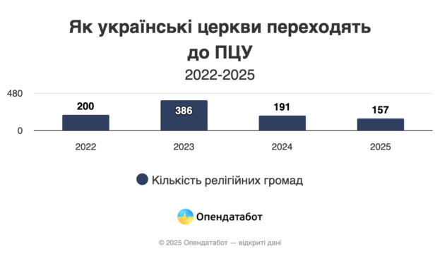 Найчастіше до української церкви навертались релігійні установи з Хмельницької (205), Київської (196) та Вінницької (105) областях. Пік переходів припав на 2023 рік: тоді змінили юрисдикцію 386 громад. У 2024 році таких було вже 191, а у 2025-му — 157.