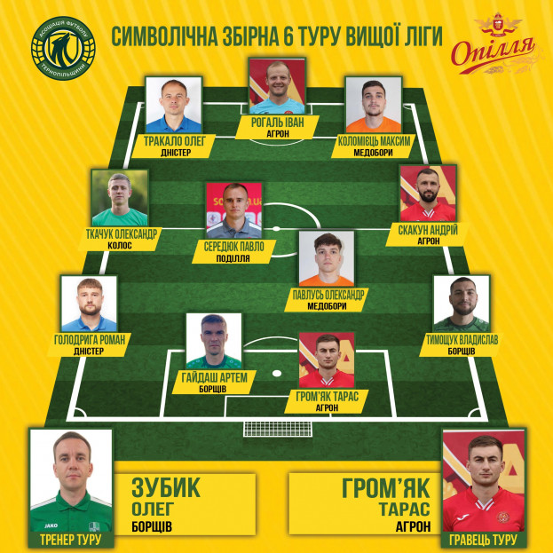 Кращим гравцем туру визнано нападника великогаївського «Агрона» Тараса Гром’яка. У виїзному матчі, центральному у турі, який відбувся у Бучачі, гравці «Агрона» впевнено перемогли одного зі своїх головних конкурентів у сезоні – місцевий “Колос” (3:0). Гром’як став справжнім героєм матчу (MVP), він у першому таймі після передачі Андрія Скакуна зі штрафного, влучно завершив домашню “заготовку”, відкривши рахунок у поєдинку. У другому таймі холоднокровно реалізував пенальті. І до двох забитих м’ячів, ще й додав гольову передачу на Андрія Скакуна. Одразу три очка за системою “гол+пас” записав собі в актив у 6-му турі Тарас Гром’як та зробив основний вклад у перемогу та повернення “Агрона” на перше місце турнірної таблиці.