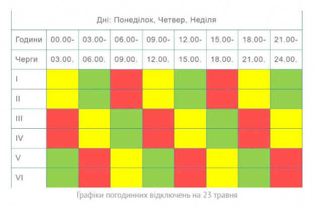 Відповідно до графіка на 23 травня відключення плануються за таким орієнтовним графіком: