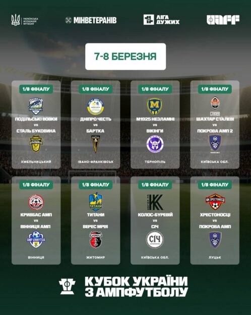 Завтра, 7 березня, у Тернополі на футбольному полі зі штучним покриттям, що у парку «Сопільче», відбудеться матч 1/8 фіналу кубку України з ампфутболу-2026. За трофей боротимуться «Вікінги» з Тернополя та «Металіст 1925 Незламні» (Харків). Поєдинок розпочнеться о 13.30.