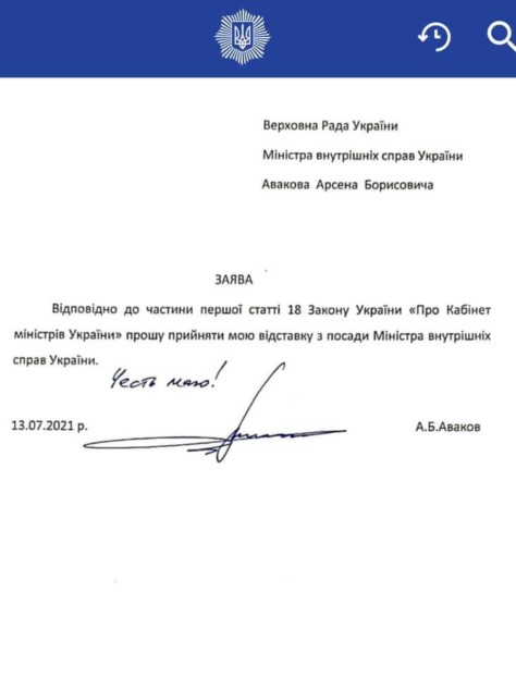 “Відповідно до частини першої статті 18 Закону України” Про Кабінет Міністрів України “подав заяву про відставку з посади Міністра внутрішніх справ. Маю честь!”, – йдеться в заяві Арсена Борисовича.