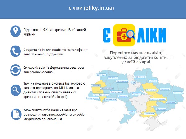 Дізнатись про наявність ліків в конкретній лікарні можна також на сайті eliky.in.ua, який був створений громадськими організаціями. До системи «Є ліки» на даний час підключена 921 лікарня з 18 областей. На сайті в пошуку можна задати торгову назву препарату або діючу речовину (МНН), який виписав лікар, і дізнатись, чи є цей препарат в конкретній лікарні. В разі наявності, він має надаватись пацієнту безкоштовно.
