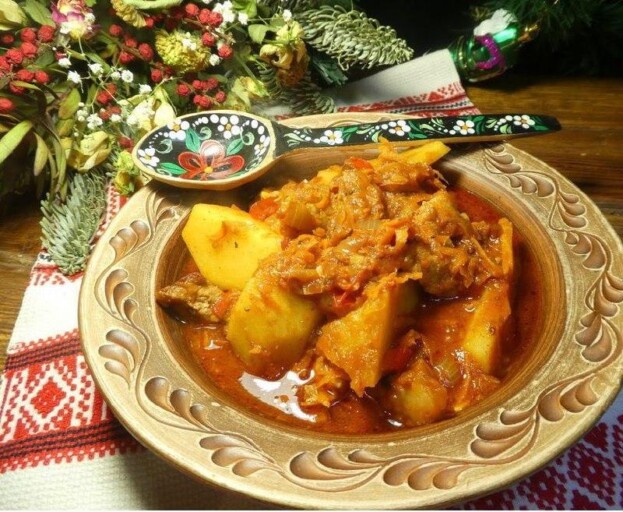 2. Картоплю почистити та нарізати часточками. Перекласти засмажку у глечик до картоплі, ретельно перемішати. Залити овочі з м’ясом водою, але так, щоби вона вкривала їх не повністю.