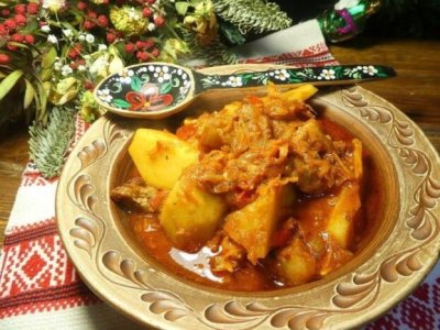 2. Картоплю почистити та нарізати часточками. Перекласти засмажку у глечик до картоплі, ретельно перемішати. Залити овочі з м’ясом водою, але так, щоби вона вкривала їх не повністю.