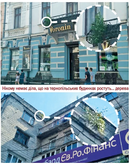 Невже місцеві чиновники, зупиняючись машинами на цьому перехресті (коли їдуть з боку готелю «Тернопіль») і чекаючи зеленого кольору світлофора, ніколи не дивилися догори і не бачили того лісу? Далі на цій же вулиці Руській є магазин одягу «Воронін». Там на балконі другого поверху є відповідна вивіска. Невже, дивлячись на неї, ніхто не побачив дерева, яке росте прямо зі щілини на балконі і загрожує через певний час обвалити на голови перехожих фрагменти балкона?!