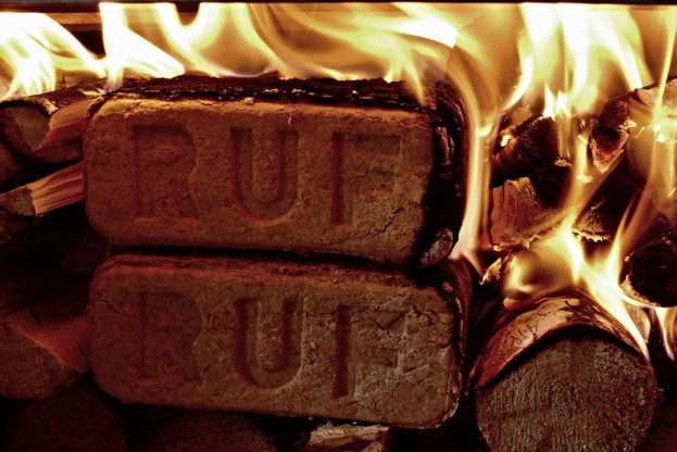 - RUF. Це прямокутні або кубічні брикети, схожі на цеглу із пресованої деревної тирси та стружки (переважно дуб, бук, сосна). Формуються під високим тиском без додавання хімічних речовин.