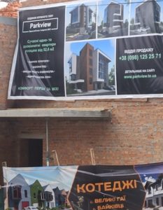 «Сучасні одно- та двокімнатні квартири, площею 52,6 м. кв. Комфорт перш за все!» – звучала інформація на банері, який висів на індивідуальному будинку.